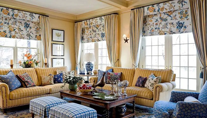 Английский вид штор пользуется огромной популярностью, занавеска занимает немного места. В данном варианте тюль должна быть более яркой, а шторы – более светлые с узором.