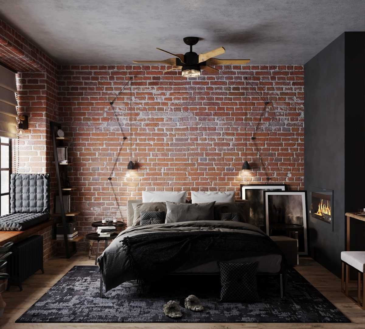 - наличие натуральной кирпичной кладки или ее имитации. Если спальня небольших размеров, то лучше сделать яркий акцент на одной из стен с помощью декоративной плитки, обоев или других материалов;