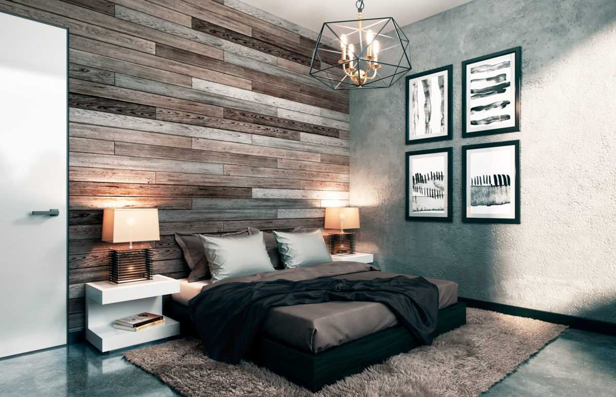 У изголовья кровати от пола до потолка выкладывается покрытие из дерева (шпонированные обои, ламинатные доски, паркетные планки), остальные поверхности красятся в основной тон. Мебель подбирается серого цвета.