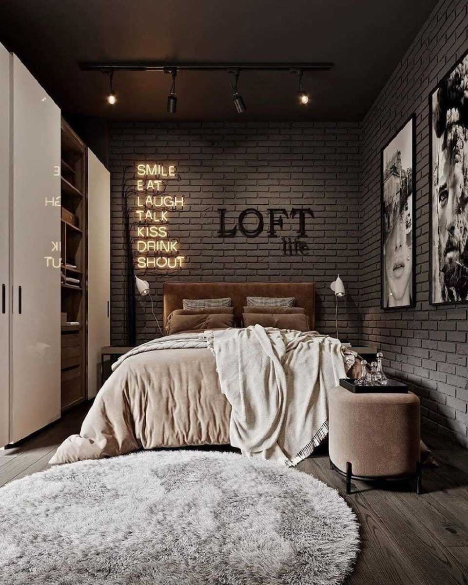 Мужская спальня в стиле лофт – это продолжение характера владельца, его визуальное воплощение. Представители сильного пола любят брутальный и нарочито грубый дизайн. В такой обстановке они чувствуют себя комфортно и свободно.