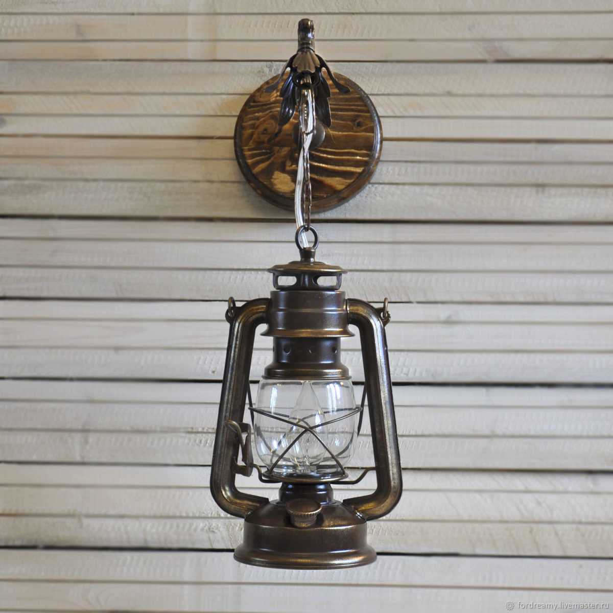 Обычно применяется комбинация из низко опущенных потолочных люстр, настенных бра в виде свечей или керосиновых ламп, аутентичных торшеров, больше напоминающих арт-объекты. Рекомендуется использовать лампы дневного света.