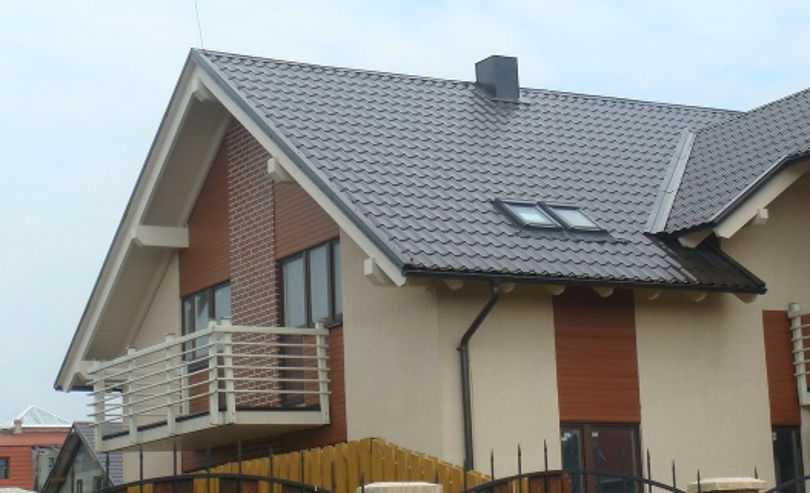 В том случае, когда фасады облицованы несколькими материалами, имеющими различный цвет и фактуру, лучше всего подойдет сдержанная крыша из серой металлочерепицы.
