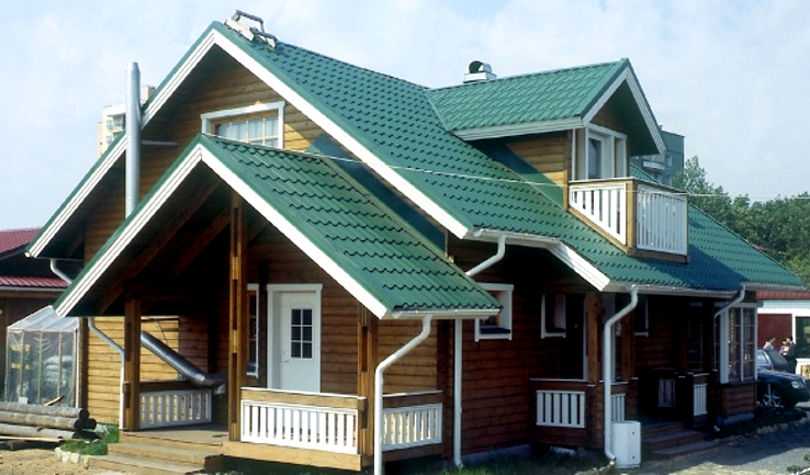 Зеленая металлочерепица с белой подшивкой на доме из бруса — очень гармоничное и нарядное сочетание