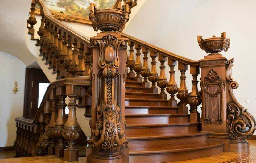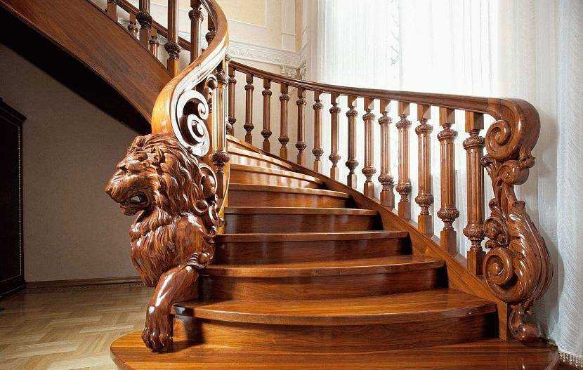 - Элементы декора: кованые перила (художественная ковка), искусная резьба по дереву (проявляется в виде завитушек, сложных орнаментов). Основание лестницы можно украсить силуэтом льва или орла.