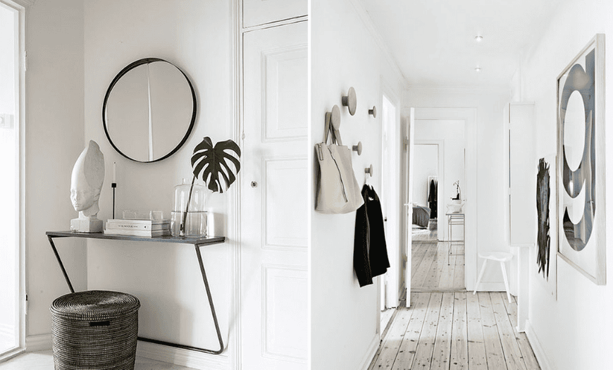 Скандинавский стиль сочетает чистоту зимних красок и тепло природных материалов. В таком коридоре преобладает белый и светло-серый цвет, но обязательно присутствует матовая фактура светлого дерева и несколько этнических деталей – например, тканый красно-белый коврик с характерными ромбами на полу и яркая абстрактная картина на стене.