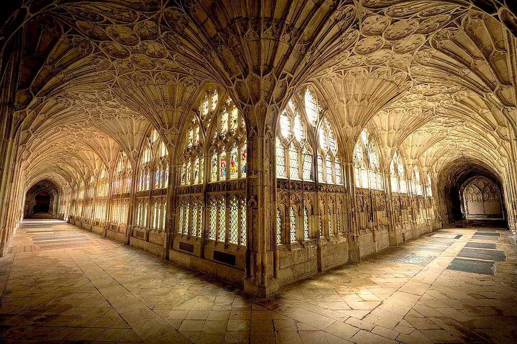 В английской готике есть уникальное направление, так называемая, . Стены и потолок обвивает орнамент, похожий на ветви винограда, линии пересекаются под прямым углом. Так оформлены интерьеры многих монастырей XVI века. На фотографии типичный коридор в аббатстве: по одной стороне витражные окна, по противоположной стене – двери во внутренние помещения.