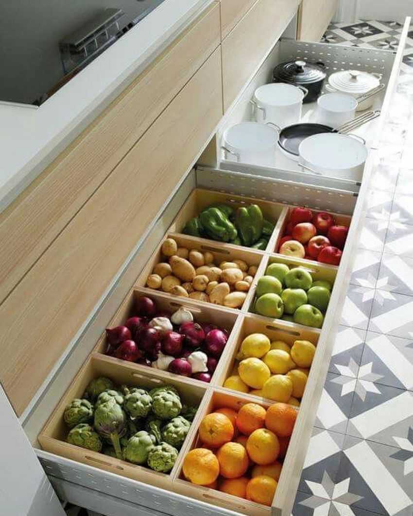 Для обеспечения упорядоченности в конструкциях горизонтального вида нередко применяют лоточки, разделители, формочки. Ряд изделий выпускается с перфорацией, к примеру, ящички для фруктов и овощей от фирмы Икеа. Овощи можно обрабатывать (чистка, мойка, сушка) прямо в сетчатых контейнерах.