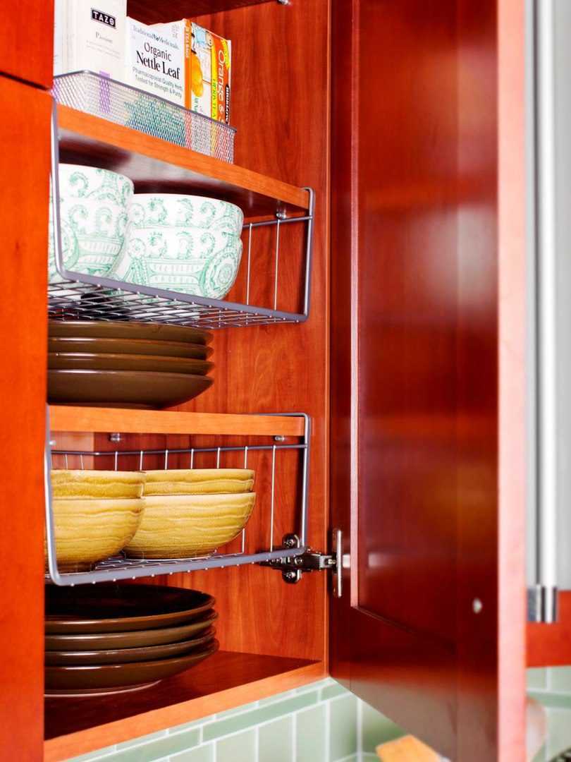 Организация хранения вещей на кухне по разным категориям подразумевает собой использование различных емкостей в шкафах и ящиках. Это могут быть всевозможные корзины, лотки или небольшие коробочки.