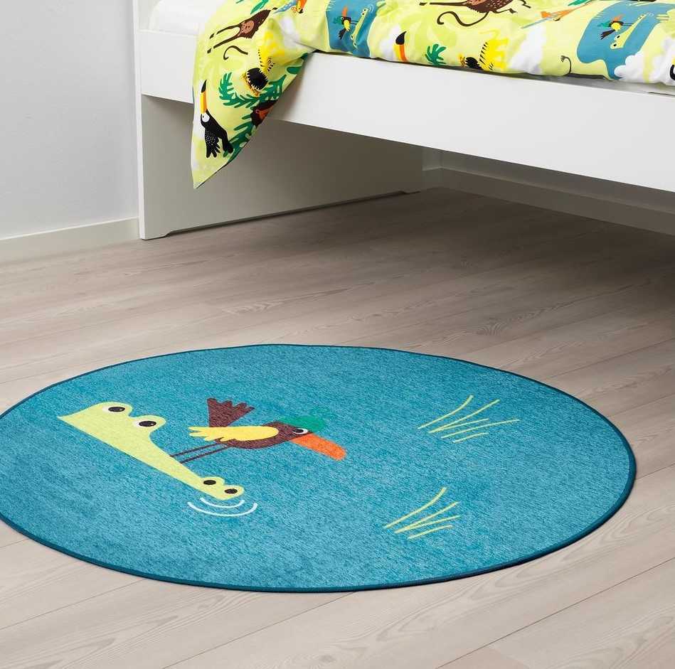 Круглый коврик диаметром в один метр – «Дьюнгельског» порадует малышей забавным рисунком, на котором изображена птица. Детям будет комфортно играть на теплом и мягком ворсе изделия.