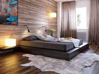 В опочивальне охотника выигрышно будет выглядеть брошенный под ноги “трофей” – шкура волка или медведя. Дизайнеры предусмотрели и такой вариант прикроватного ковра