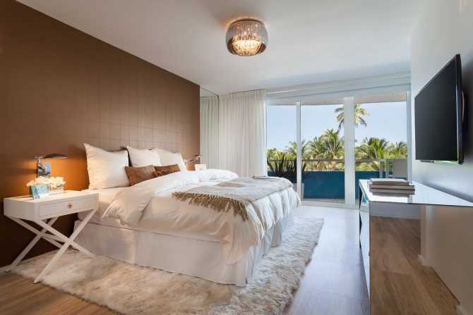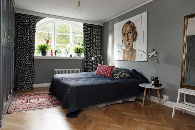 2. Под цвет мебели, но наоборот. Белизну дивана подчеркнет черный ковер, а теплоту бежевой кровати — темно-коричневый. То есть данная схема подразумевает использование ковра, цвет которого прямо противоположен цвету мебели, расположенной рядом с ним.