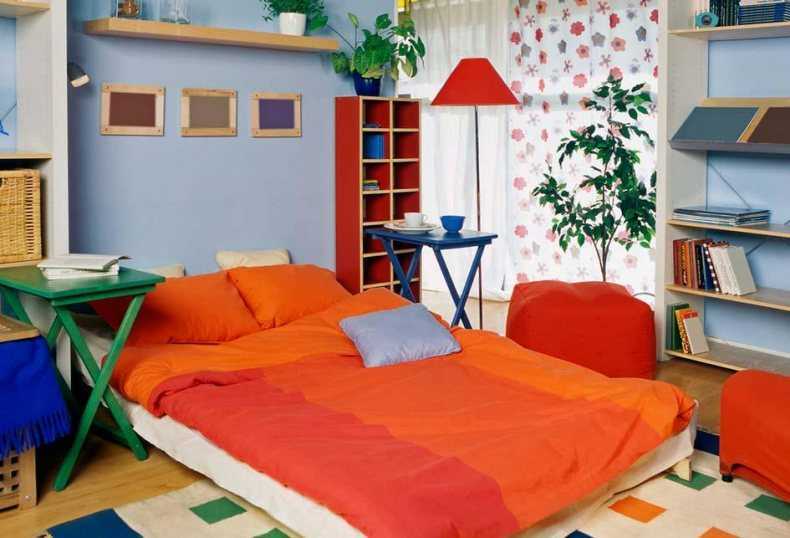 Не окажется ли основного цвета слишком много, если вынести его еще и на пол? Осторожность особенно важна в том случае, если цвет стен и штор является не нейтральным, а «радужным». Необходимо обильно разбавить базу мебелью и декором иного цвета