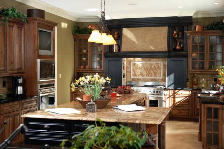 - Пол из комбинированной плитки или камня в бежевых и коричневых оттенках под цвет гарнитура.