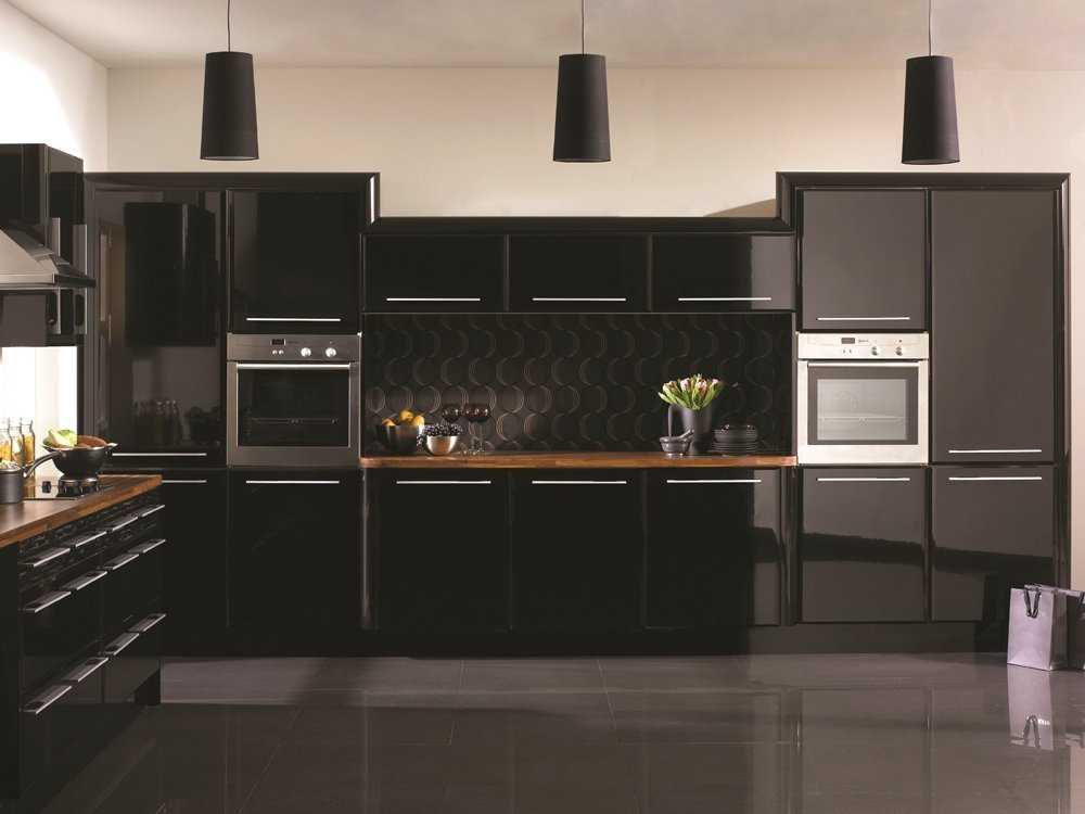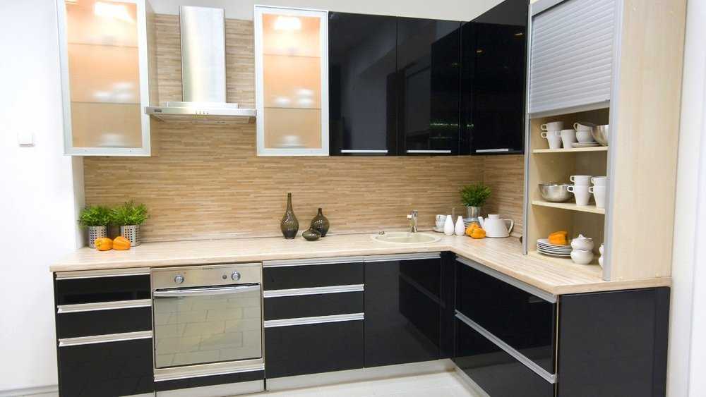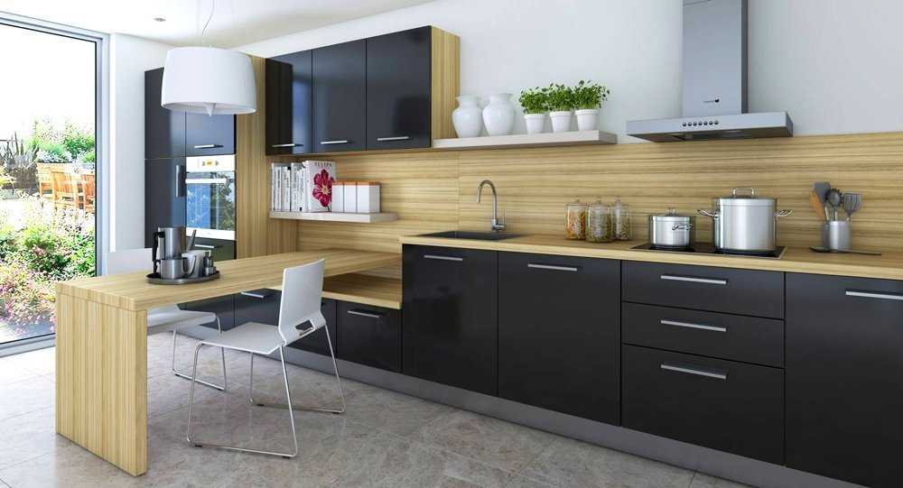 Черным. Эта комбинация будет отлично дополнять современный технологичный интерьер кухни. Основной акцент черного приходится на рабочую зону, обрамление рамочных модулей, источники света необычной формы, кухонный фартук или столешницу. Последние варианты являются смелыми, которые способствуют визуальному увеличению кухни.