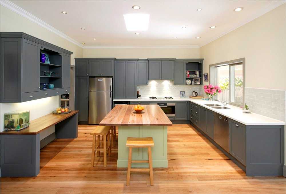 Форма размещения должна основываться на габаритах помещения и планировки. Исходя из этих параметров, нужно выбирать линейный, угловой, П-образный или островной гарнитур. Каждый из вариантов можно выгодно обыграть и на маленьких, и на больших площадях.