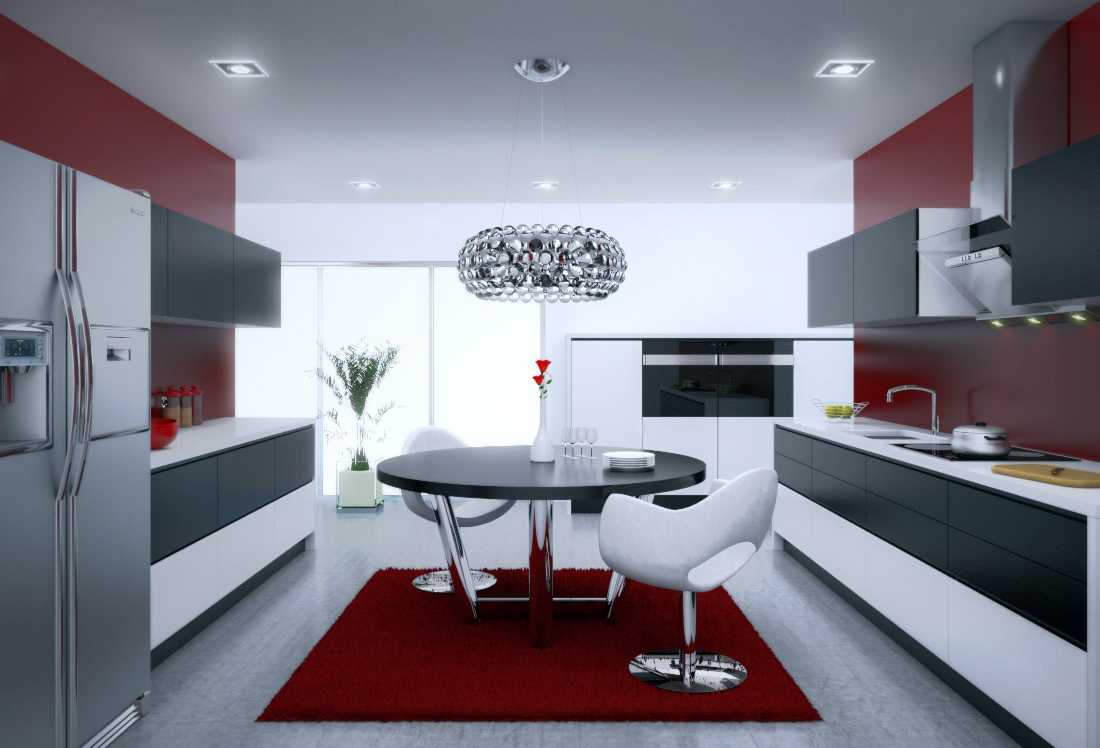 Классикой считается красно-белая кухня. Когда низ кухни делается темным, а верх белым, получается гармоничный контрастный дизайн, визуально делающий стены выше.