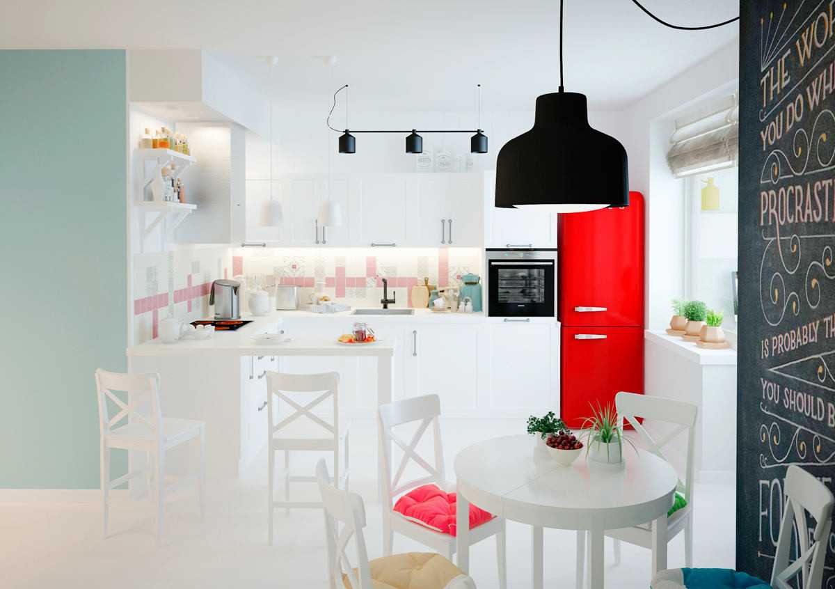 Современная белая кухня задействует не более трёх основных цветов: при большом обилии красок дизайн получится перегруженным. Наиболее распространены два варианта: белый + сочный контрастный цвет и белый + один спокойный цвет + немного яркого акцента.