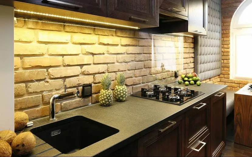 Кирпичным делают и фартук на кухне, что позволяет подчеркнуть стиль помещения.