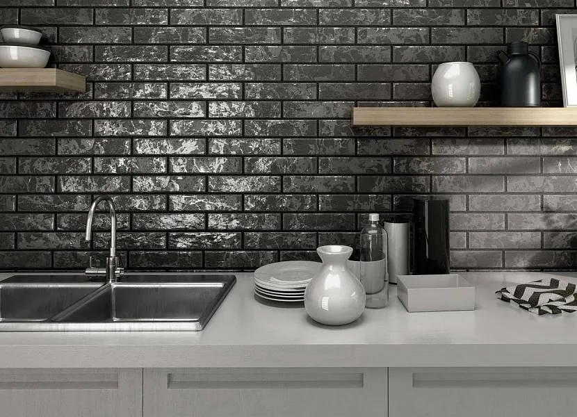 Серый глянцевый кирпич с отражающим эффектом очень оригинально смотрится в интерьере
