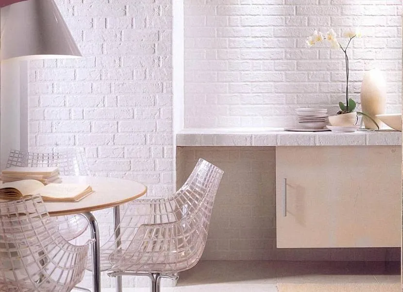 Если выбрать качественные дорогие обои, можно сделать стену из белого кирпича в интерьере, внешним видом ничем не отличающуюся от кирпичной кладки. Современные материалы имитируют не только фактуру, но и цвет настоящего белого кирпича.