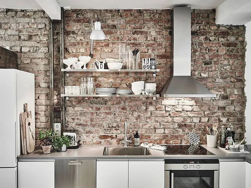 Кирпичная кладка часто используется в скандинавских интерьерах для оформления акцентной стены или кухонного фартука. Для сканди-интерьеров обычно выбирают окрашивание стен в белый цвет, а вместо аутентичного кирпича, используют 3D-панели, клинкерную плитку или фактурные обои с имитацией кирпичной кладки.