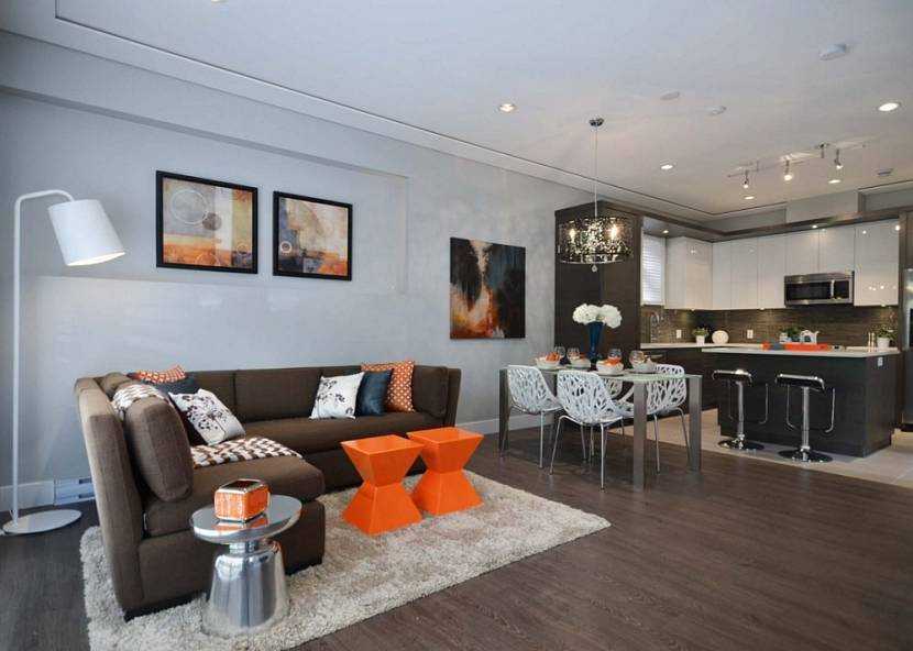 Обстановка прямоугольного зала, совмещенного с кухней, фото
