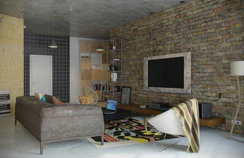 Лофт. Прекрасно подчеркнет свободное пространство без лишних предметов. Оформление из грубых материалов натурального происхождения определяет дизайн комнаты. Дополнит интерьер мебель на колесиках, столы и полки из стекла и небольшие диванчики.