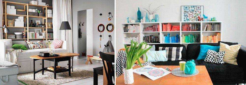 Хорошая идея дизайна гостиной маленького размера – откидной стол. Очень модны стройные, ажурные книжные шкафы. Мебель, стоящая у стены, становится красочным фоном для зоны отдыха, благодаря облегченной конструкции — не перегрузит интерьер. При данном расположении, зал становится зоной отдыха, приятной, уютной библиотекой.