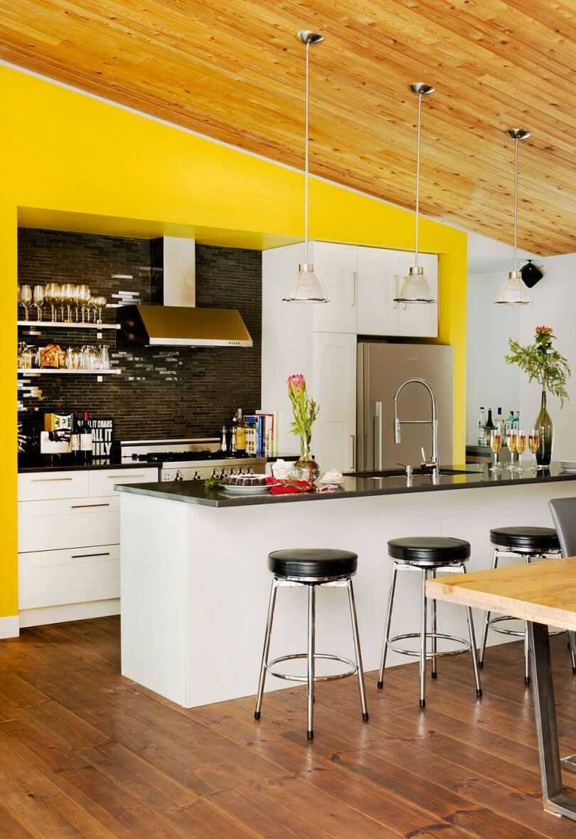 Для стен лучше использовать пастельные тона. Однако при создании акцентов нужны более насыщенные цвета, например, желто-оранжевый возле кухонного фартука.