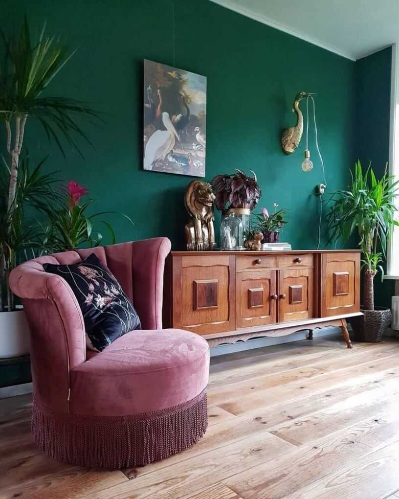 Для создания контрастного интерьера можно выкрасить стены в насыщенно-зеленый цвет и положить на пол светлый паркет.