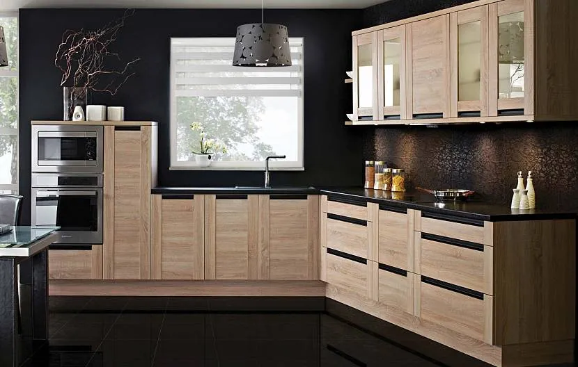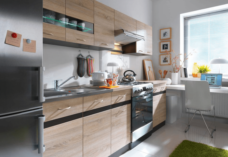 Обычно кухня имеет небольшие размеры, при этом активно эксплуатируется и сильно загрязняется. Лучше всего применять здесь гарнитуры из ламинированного ЛДСП, который прост в уходе и служит много лет. Светлая столешница под дуб станет изысканной деталью интерьера. Также можно выполнить в цвете дуба все фасады мебели, скомбинировав их с более темными элементами в нижней части кухонного гарнитура.