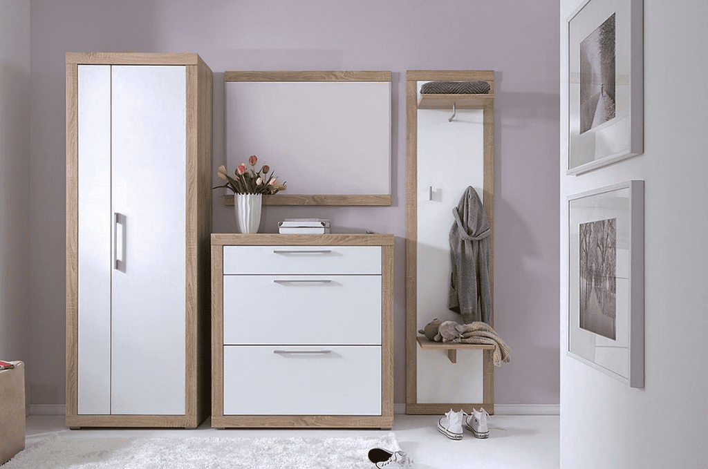 Это шкаф и небольшие низкие тумбочки для обуви. Поскольку коридор — самая маленькая часть квартиры, именно здесь нам больше всего подходит метод расширения пространства, который дает легкий оттенок сономы.
