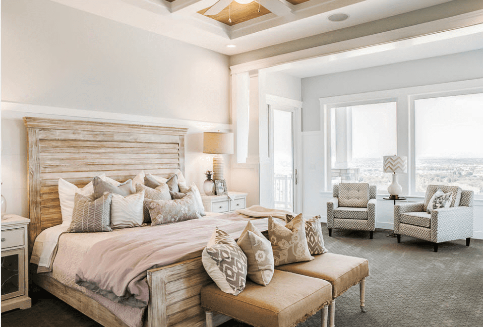 Светлый тон дерева в спальне смотрится необычно и удивительно нежно. Кровать из розового золота, небольшой комод и зеркало создают уют и атмосферу. Мебель должна быть компактной, невысокой, красивые композиции или на комод можно поставить пару изящных ваз, а туалетный столик в обрамлении зеркала зрительно расширит пространство.