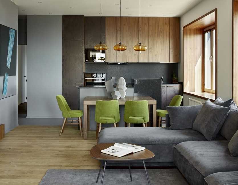 Кухня-гостиная необычной формы отличается наличием одного, двух или более нетипичных углов. Для того, чтобы уравновесить неправильную планировку, выполняют зонирование пространства. В комнате в форме трапеции можно выделить функциональные зоны контрастным цветом или сконструировать подиум.