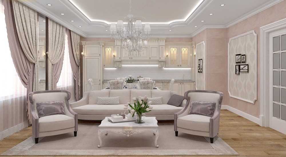 Считается, что наиболее подходящим стилем для оформления гостиной, совмещенной с кухней, является неоклассика. Во время выбора стоит ориентироваться на интерьер других комнат в квартире.