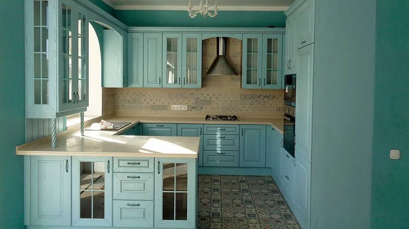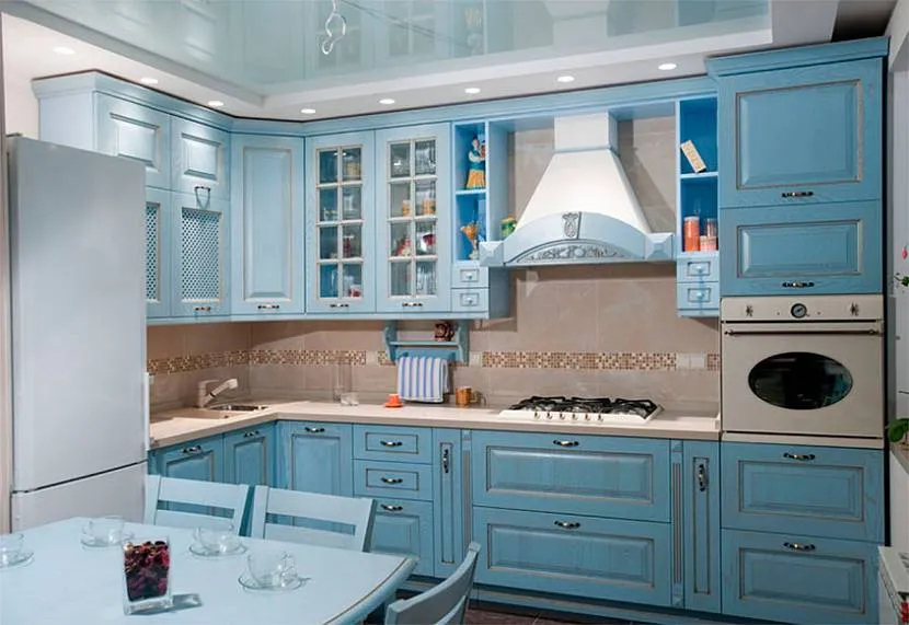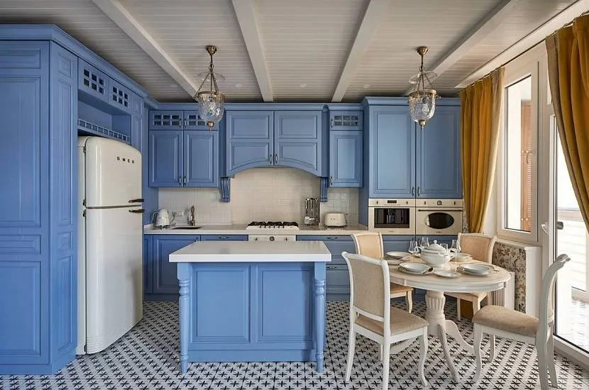 Его используют на стенах, потолке и полу и при оформлении фасадов гарнитуров. В качестве основного берут пастельный тон. Бело-голубые кухни давно стали классикой в этих стилях.
