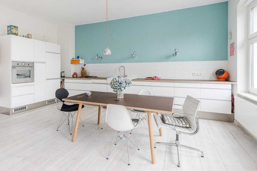 Здесь в голубом оформляются отдельные элементы: столы или стулья, шторы или кухонный фартук, иногда берут насыщенные оттенки, чтобы акцентировать внимание на отдельных деталях. Для любого стиля характерно использование именно светлых тонов
