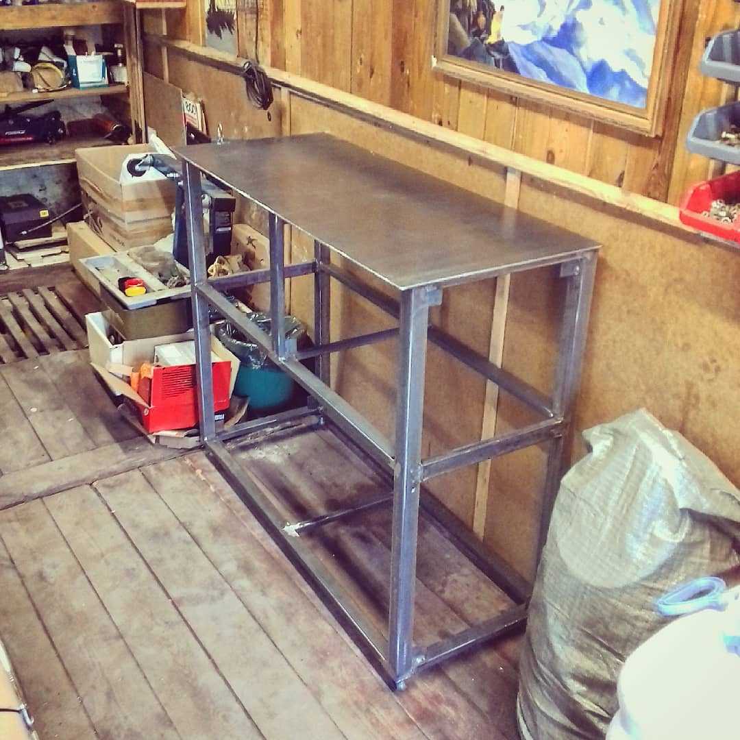 - Стол-верстак. Рабочий вариант, который используют в мастерских, гаражах. Подходящая длина столешницы составляет 220 см, ширина — 75 см, высота — 85–90 см.