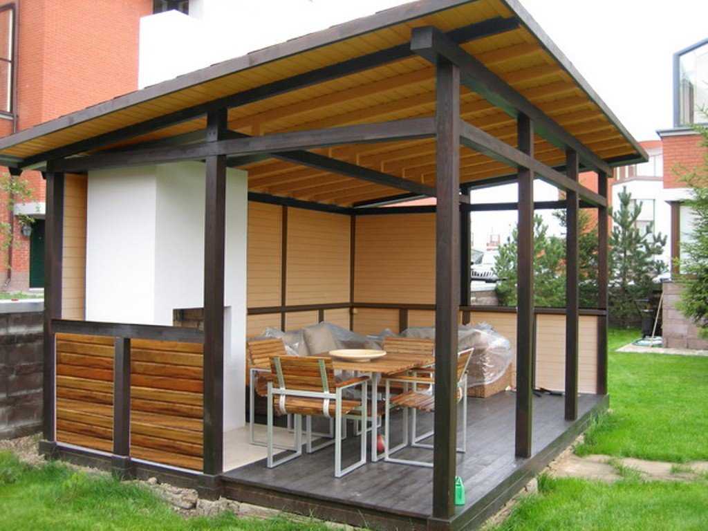 - Навес, примыкающий к дому. Самый простой для возведения способ. Требует меньше всего вложений. Но есть отрицательный момент. При готовке все пары и дым будут идти в сторону дома. Это может привести к порче стен или другого отделочного материала.