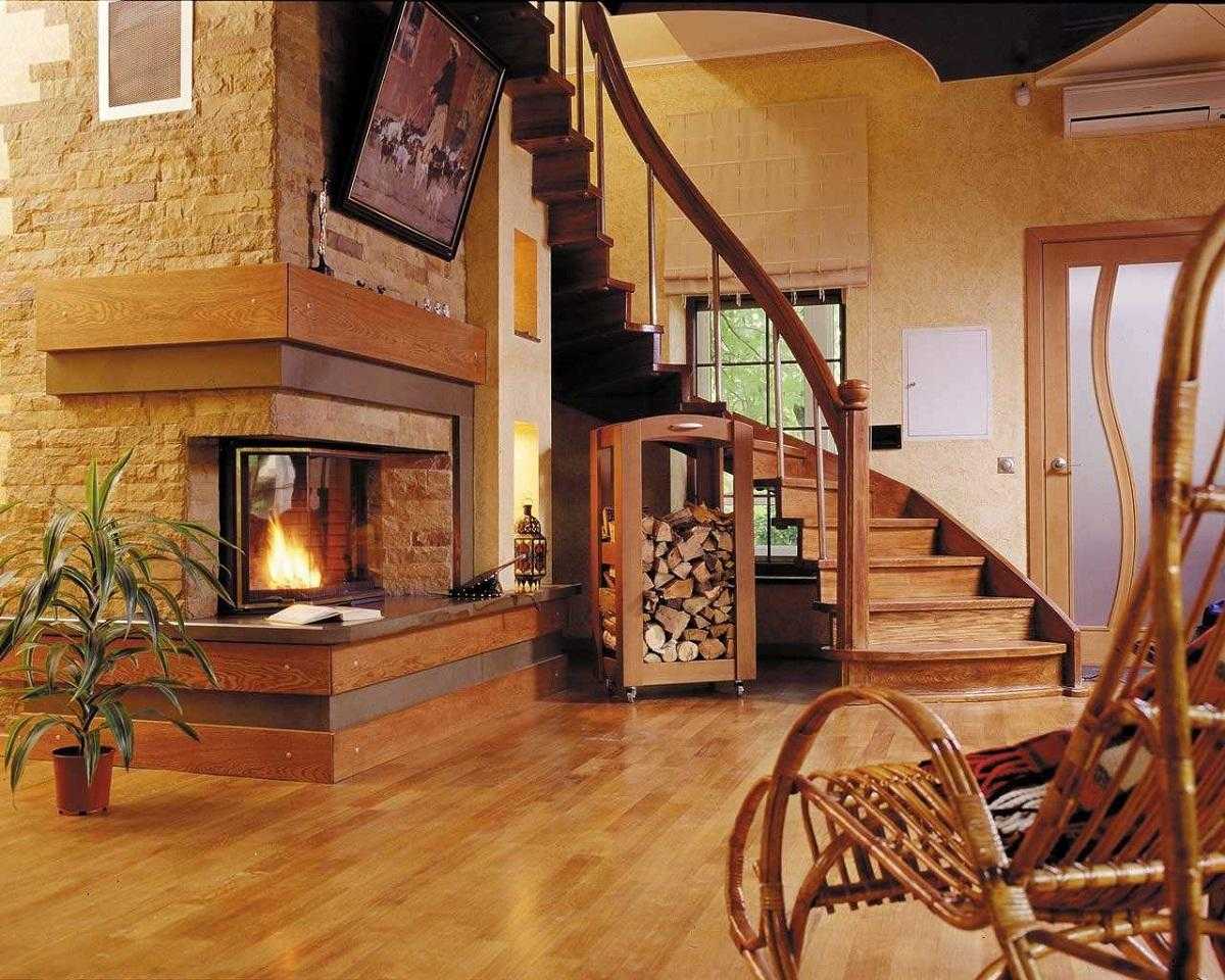 Полностью деревянный дом, характерный для таких интерьеров, благодаря лестнице в кухне-гостиной получается еще интереснее. Расположите гарнитур и технику непосредственно под ней. Правда, для этого придется делать ступени достаточно широкими — убедитесь, что площадь комнаты это позволяет.