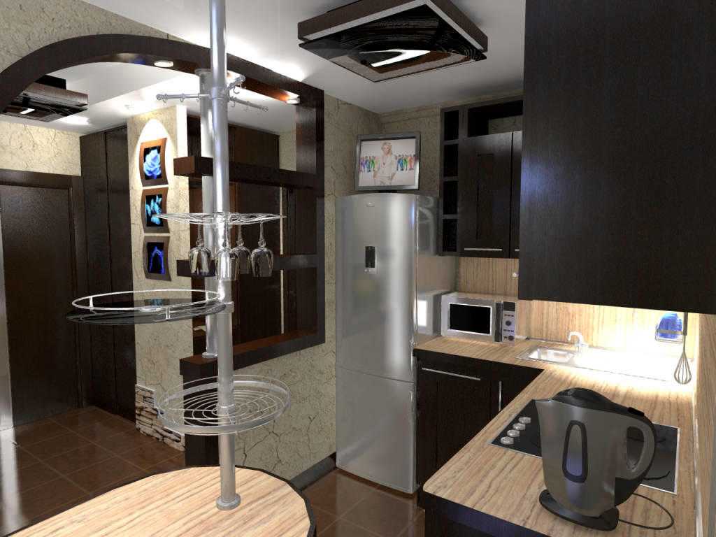 Чтобы перенести кухню в коридор следует очень компактно организовать пространство. Для этого выбирают г-образную планировку, которая может включать в себя барную стойку.