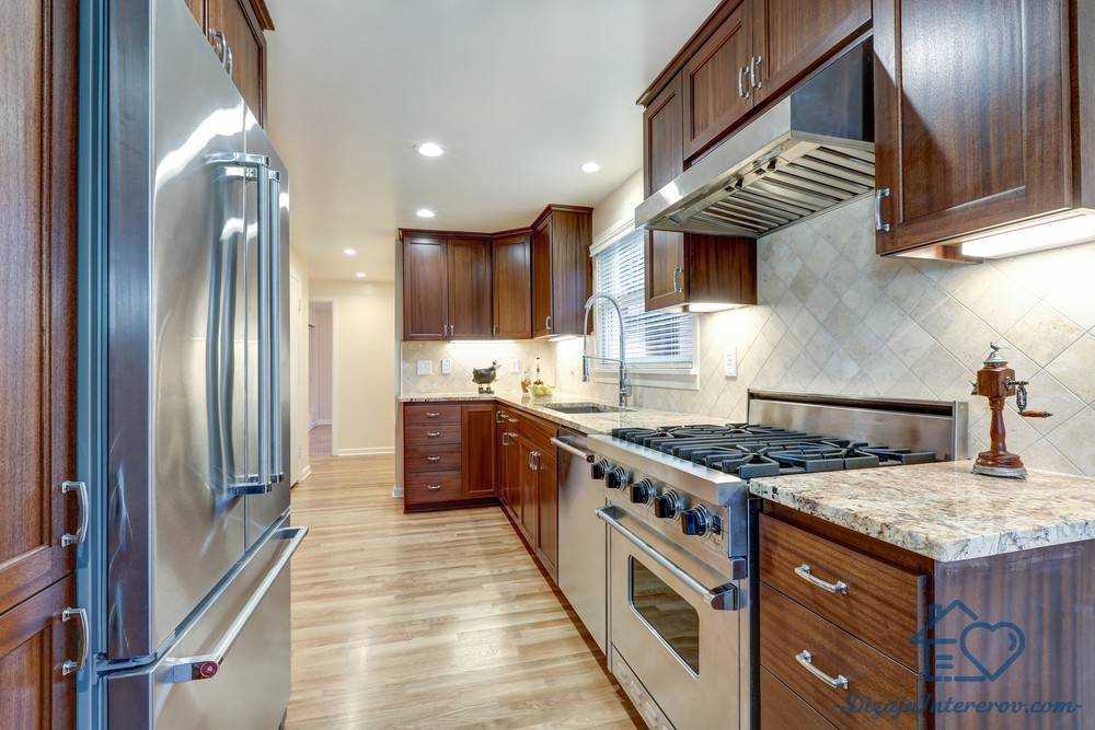 Параллельная планировка позволяет создать практически идеальный равнобедренный кухонный треугольник. Для этого раковина и холодильник располагаются с одной стороны гарнитура, а плита — посередине напротив.