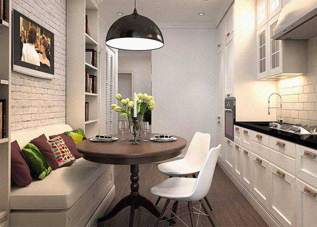 Пространство, за которым буду проходить приемы пищи, — важное место в доме. В случае с небольшой узкой кухней в идеале вынести его за пределы помещения, например разместить красивую обеденную группу в гостиной-столовой. Но если такой возможности нет, приходится выкручиваться