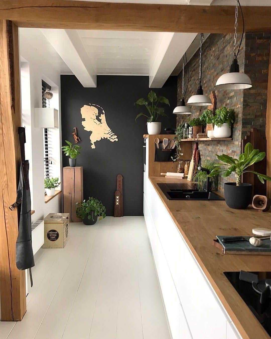 В интерьере узкой кухне не возбраняется применять сочные теплые, а также черные цвета