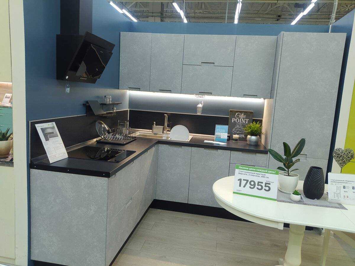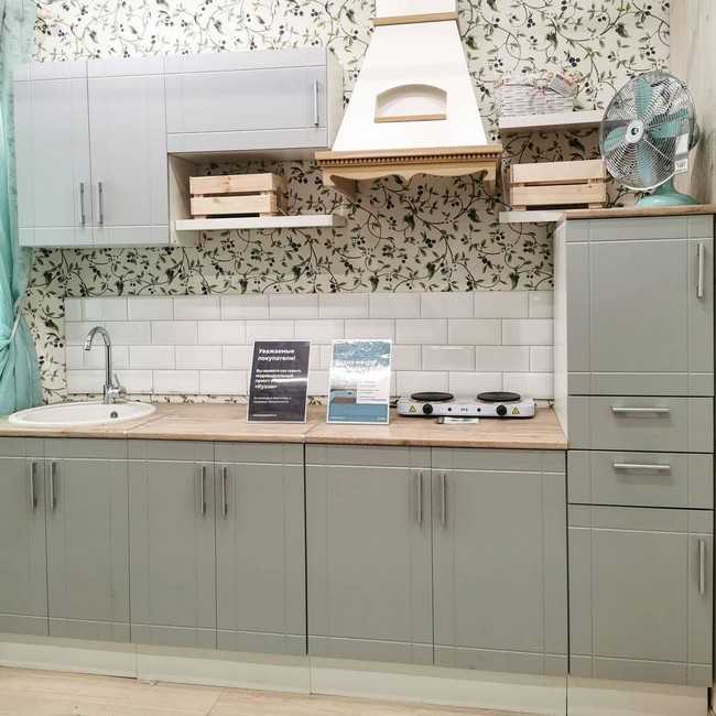 Гуляя по магазину, можно прицениться на основе выставочных образцов в магазине. В Леруа Мерлен дизайнеры составляют для покупателей несколько готовых проектов и вариантов сочетаний фасадов, столешницы и фурнитуры.