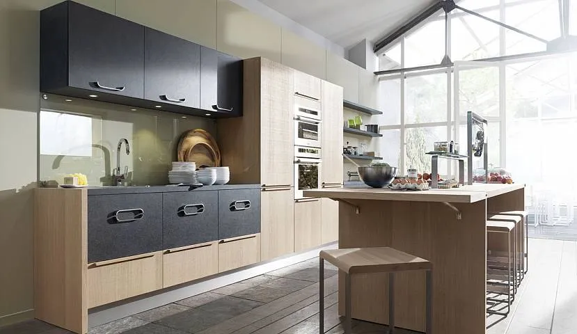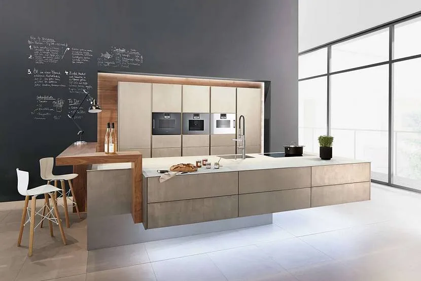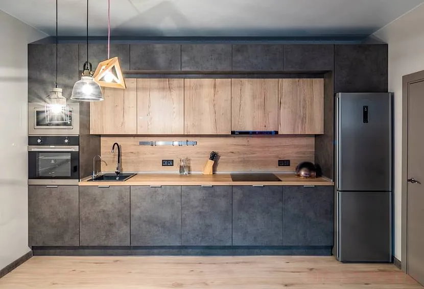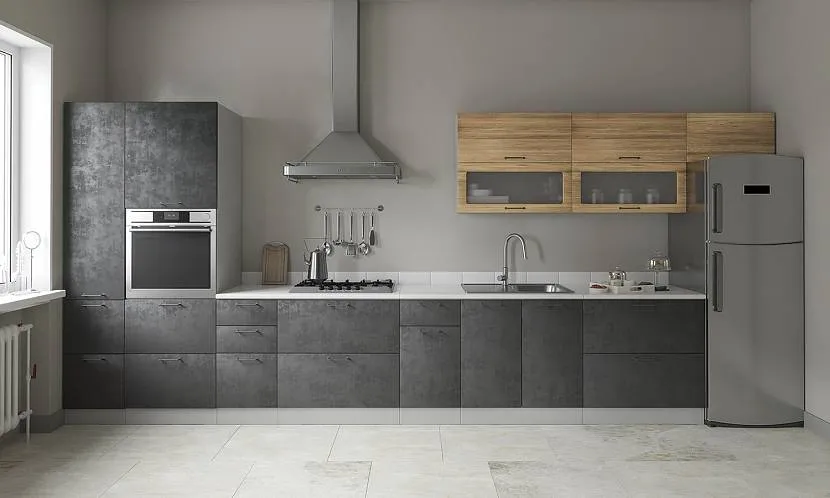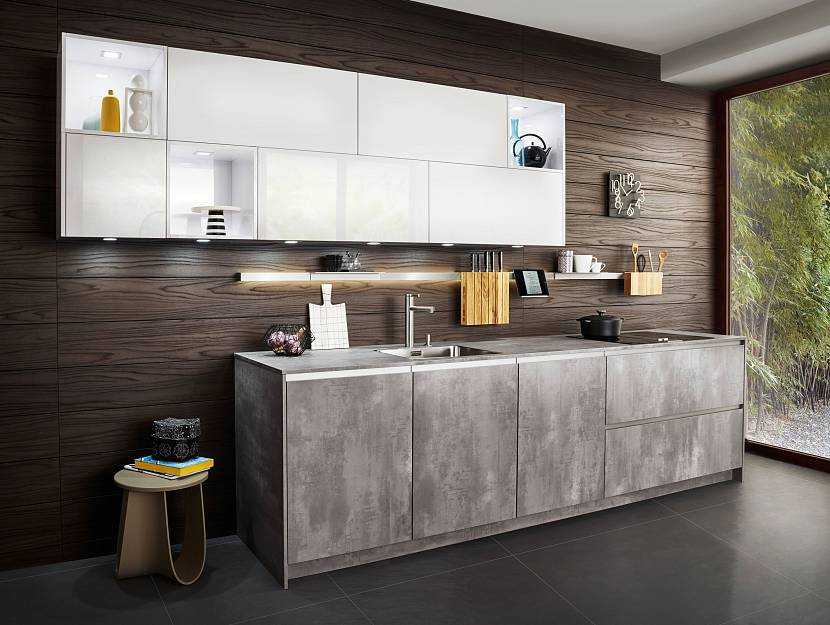 Производители, стремясь расширить ассортимент, предлагают комбинированные варианты кухни с бетонными и деревянными фасадами: