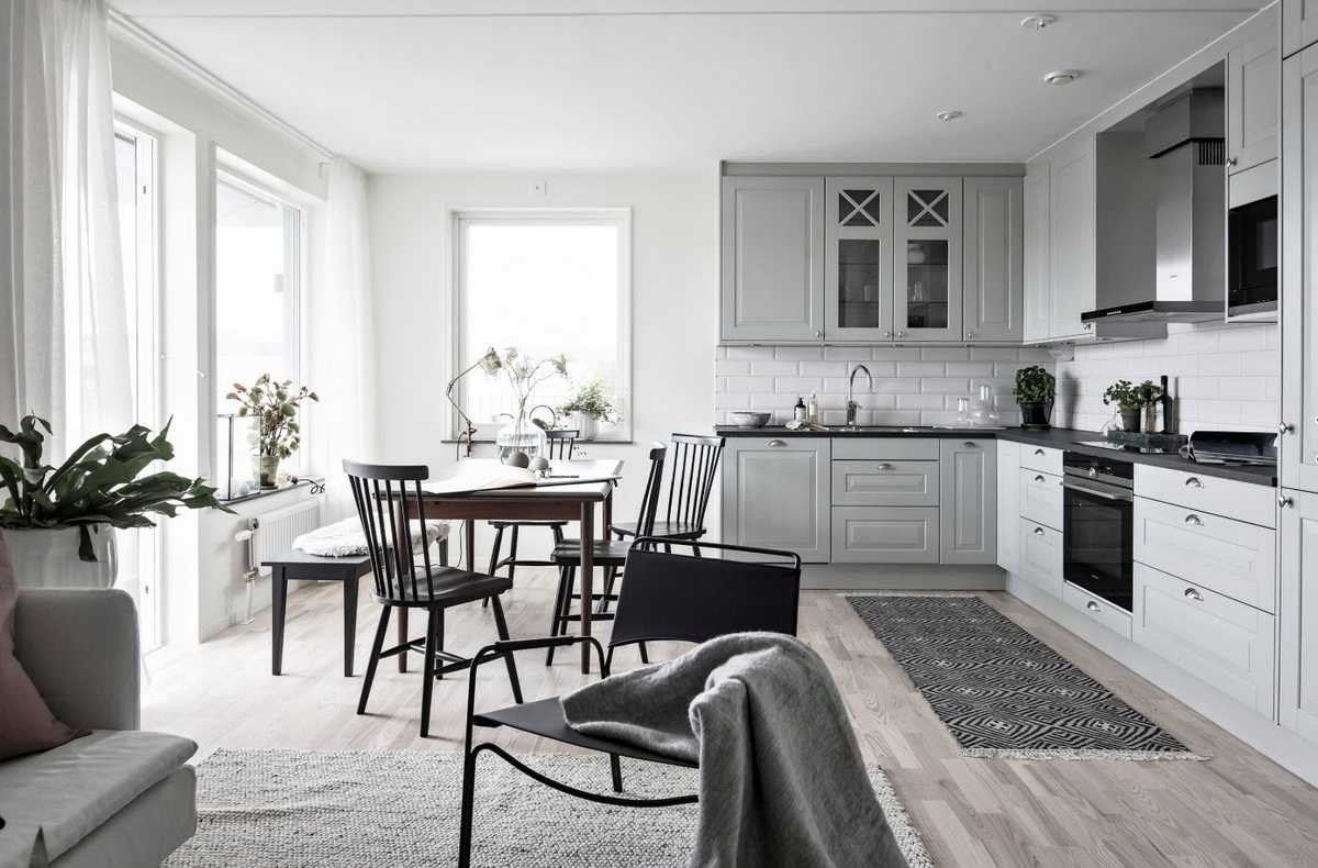 Темные оттенки нежелательно использовать для отделки стен маленькой кухни, но если она хорошо освещена, то при желании вы можете оформить этим цветом только одну акцентную стену. Например, в этой маленькой кухне в скандинавском стиле темно-серые обои украсили одну стену в обеденной зоне.