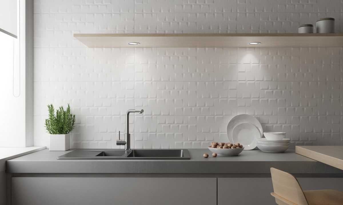 - Бетонированная столешница — неожиданные структуры для минималистских образов. Идеальная белизна классической квадратной плитки подчеркнет фактуру каменного раствора, и это станет изюминкой сего бесхитростного интерьера.