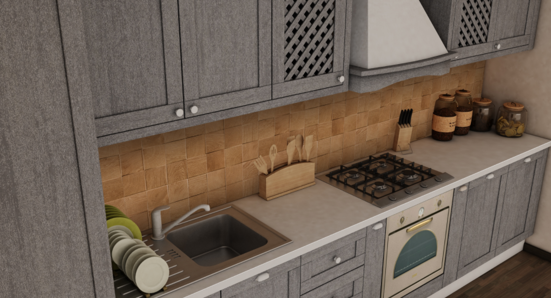- Светлые породы древесины придадут кухне изысканности, темные – брутальности. Более доступным вариантом будет пластик.