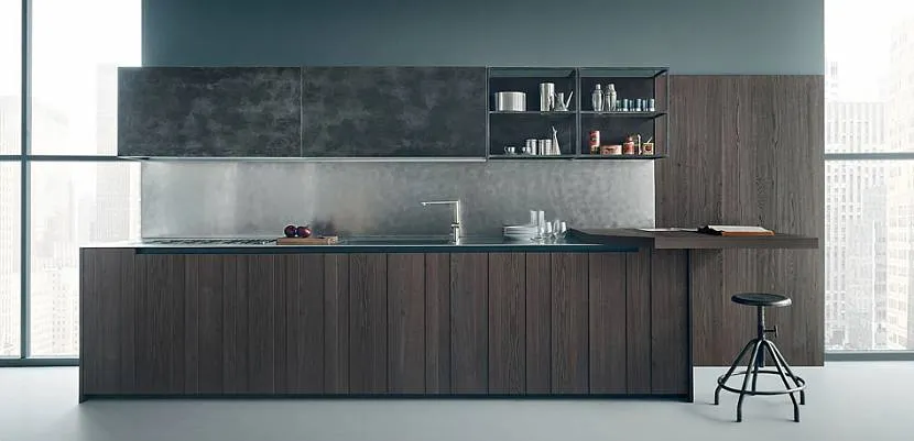 - Древесина. Если вы выбрали для кухни бетон и дерево, интерьер всегда будет оставаться в тренде. Деревянные фрагменты поддерживают на кухне атмосферу тепла и уюта, уравновешивая строгий серый цвет. Интерьер получается более светлым и визуально лёгким.